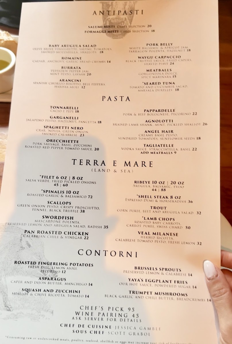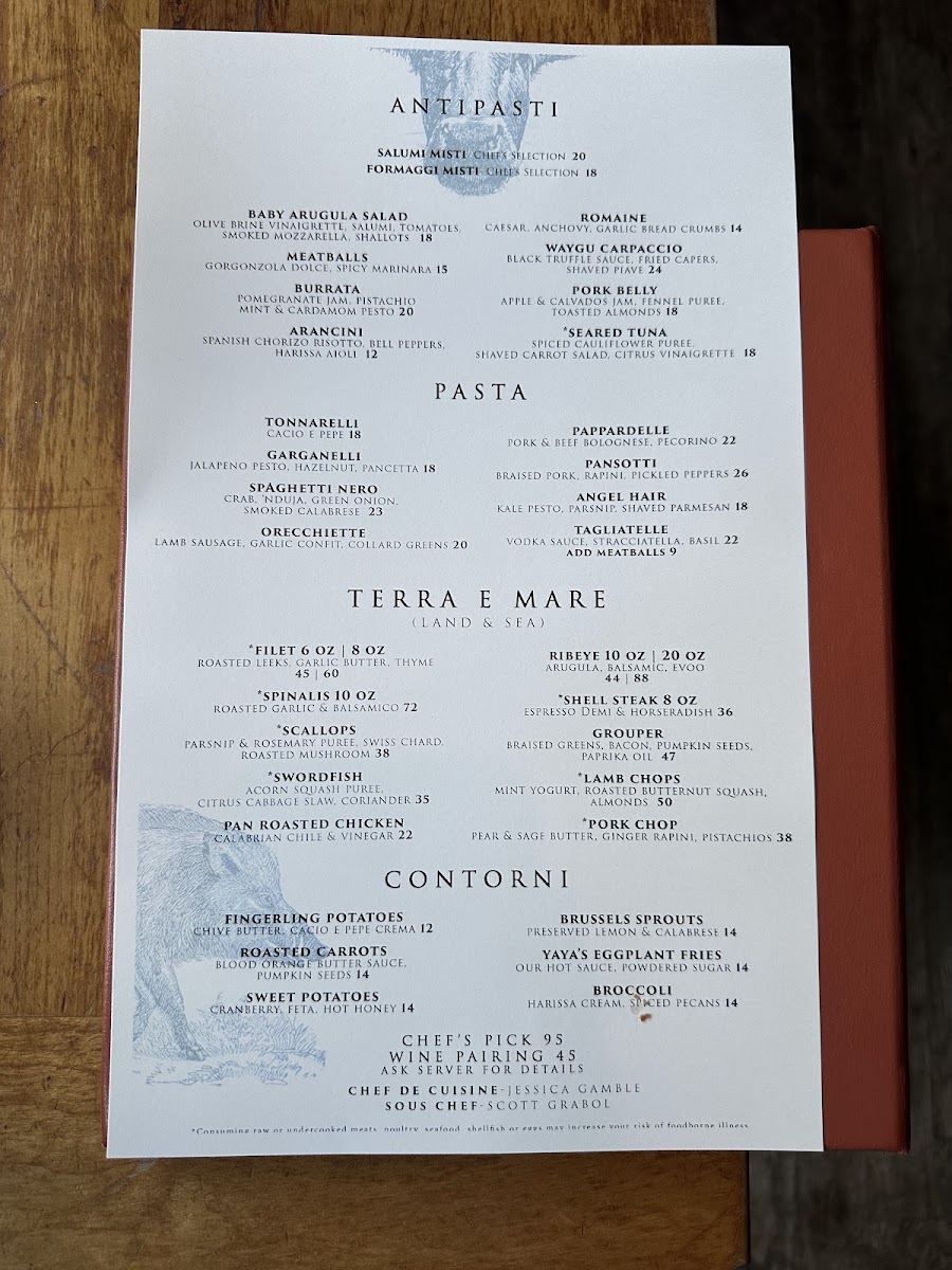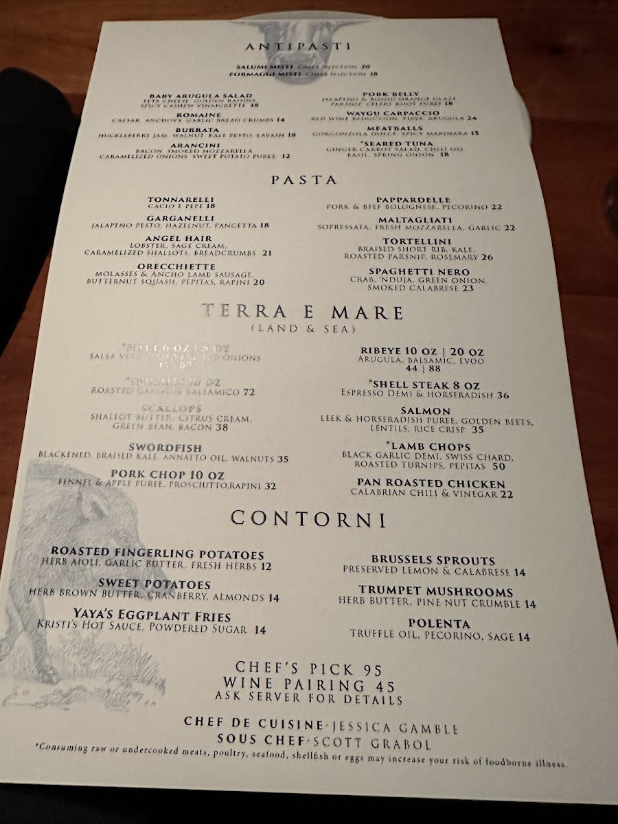 Accompanying these main dishes, the Contorni or side dishes include an assortment of flavorful options. Brussel Sprouts are crispy and seasoned just right, while the Roasted Fingerling Potatoes offer a satisfying, earthy accompaniment. The Broccoli is simple yet flavorful, and the Sweet Potatoes bring a touch of sweetness to the plate. Yaya's Eggplant Fries are a must-try, offering a crunchy texture that pairs wonderfully with a variety of sauces.